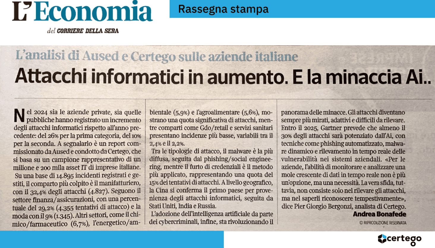 State of Cybersecurity è la ricerca realizzata da Certego per AUSED – l’Associazione tra Utenti di Sistemi e Tecnologie dell’Informazione che raccoglie oltre duecento aziende italiane – ed è stata recentemente ripresa anche da Il Corriere della Sera, a conferma della sua rilevanza nazionale.